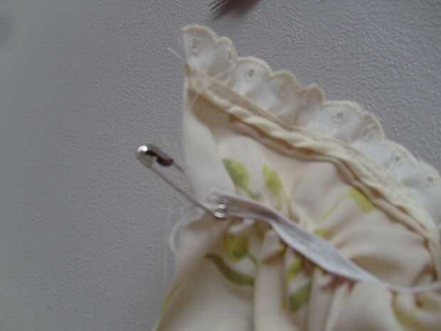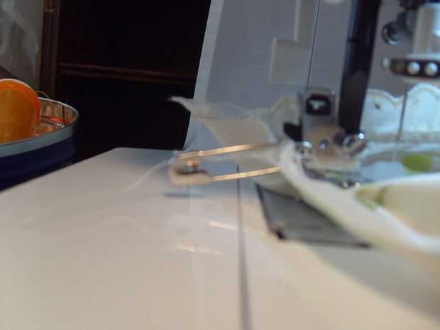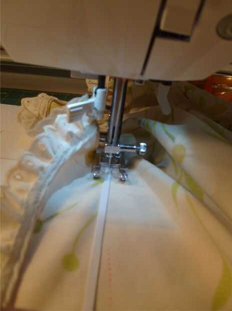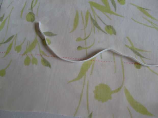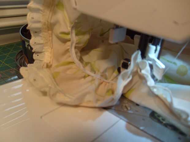 Abordar primero las mangas por coser un cordón de ajuste en los puños.  Doble pliegue el borde 1/4" y el pin el cordón del ajuste en el lado equivocado.  (Puede omitir cualquier cordón o cortar como se desee).  Puntada recta simplemente, quitar el derecho de los pernos antes de llegar a esa zona.  La tercera foto estoy mostrando a algunos enlace que usted podría elegir a coser en el interior de la manga a ambos lados del enlace y luego deslizar el 1/4" elástico interior con un alfiler para reunir.  No quiero a todo el exceso tejido en el área de la muñeca y generalmente decido coser derecho elástico sobre el tejido con la puntada elástica, si tienes uno en tu máquina.  Si no, utilizar una puntada zigzag estrecha sobre el elástico.  Decido colocar un perno de seguridad en la zona de donde me alojé cosido el comienzo del elástico, simplemente porque tienes que tener esta área como estira la parte delantera del elástico toda la longitud de la manga y empezar a coser.  Usted necesita ser capaz de sostener la tela y elástico en ambos extremos para empezar a coser y no se agarre el área debajo de la pata usando sólo los dedos.  Asegúrese de cortar el elástico un poco más grande entonces la circunferencia de la muñeca.  Virar el comienzo en lugar con la costura hacia atrás y el pin de entrada por lo que se puede agarrar de la parte posterior.  No tire de la parte posterior, pero use para mantener y trabajar a la tela a través de como mantener el elástico estirado hacia fuera en frente como coser como en la imagen 7.  Si mide y cosidos, acabarás con las muñecas que se reunieron muy bien, y no debe ser un ajuste demasiado apretado una vez coser los puños juntos.