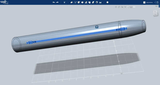 1 | En el menú de primitivas en el 123D diseño Seleccione un cilindro. Introduzca una longitud de 350mm y un radio de 25,5 mm.