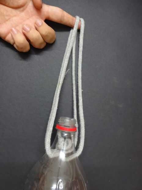 Hacer 4 agujeros cerca de la boca de la botella con una hoja, brújula o cualquier cosa puntiaguda! pasar la cuerda a través de estos orificios para hacer dos bucles que lo colgamos con el envase de botella de la planta.