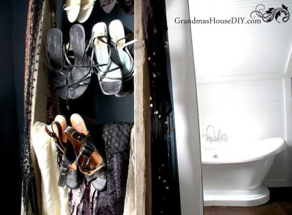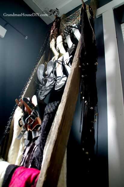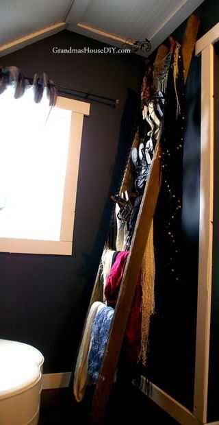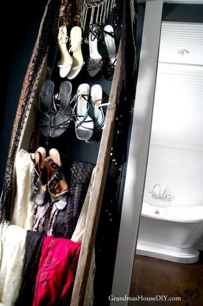 Tenía el lugar perfecto en nuestro armario de dormitorio de la escalera, ubicada en la esquina de enfrente de mi PUF blanco cuero copetudo y justo al lado de la puerta de nuestro cuarto de baño. Comencé a cavar y encontraron todos mis tacones y bastante tiros que han estado en almacenamiento durante tres años! Creo me hago tiempo vestir para arriba todo bonito y llevar esos tacones! Como un zapatero de escalera no puedo creer lo bien que funciona! Estaba realmente decepcionado al darse cuenta de que había purgado todos sino cinco pares de tacones de mi colección, cuando nos mudamos hace dos años. Podría ser un poco de un acaparador pero, cuando se trata de cosas que no utilizo, todo lo contrario, si va a ser en un cubo en almacenamiento durante diez años sin mi siempre buscando en él, tocarlo, o lo necesidad de, voy a donarla. Que es lo que hice con lo que debe haber sido al menos una docena de pares de zapatos de tacón altos que no llevaba nunca. No, sin embargo, de deshacerse de una bufanda simple o tiro y estoy tan contenta que no! Ahora tengo un hermoso lugar para colgar a todos ellos y les zapato apagado con los pocos tacones que me han dejado! El hardware viejo en la parte superior de la escalera era perfecto para colgar algunos de mis tiros bastante. Y todos los peldaños (incluso uno roto!) el resto de mis bufandas, mantas y zapatos sin problema!