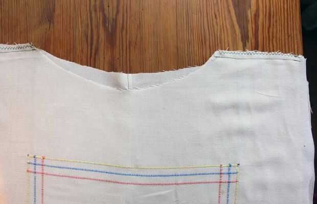 Primero tomé una camiseta para localizar la posición correcta para el corte. Luego coser las articulaciones de los hombros y fija el material de costura zig-zag.