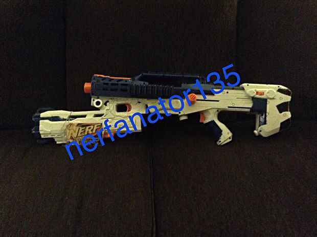 He modificado una Blastzooka extrema BuzzBee para disparar 6 Nerf dardos elite, estilo de la escopeta. Inicialmente lo hizo disparar dardos solo, pero era demasiado poderoso como para dejar que mis hijos utilizan. Deja ronchas en su cuerpo y también