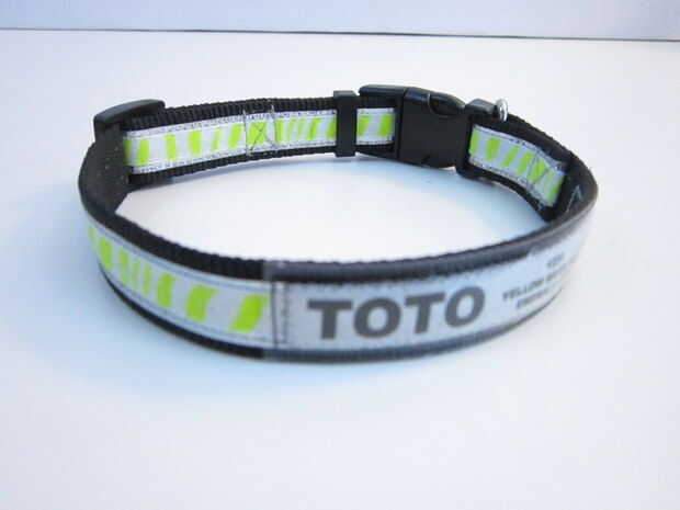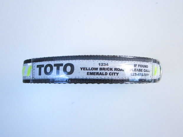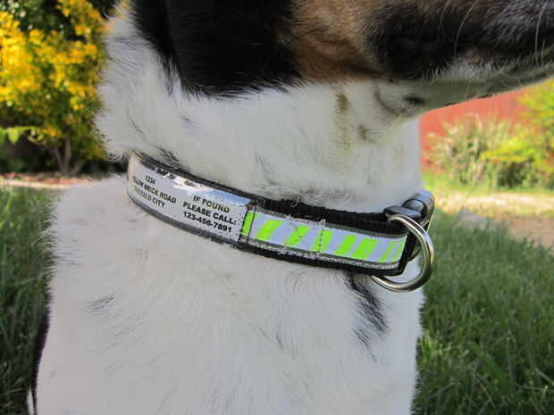 Encontré algunos básicos collares de perro en el almacén del dólar y había actualizado con un poco de cinta y una etiqueta de nombre de hierro.