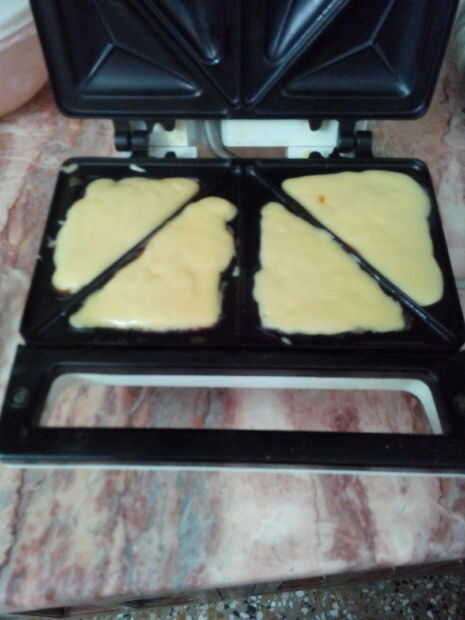 Consejo: Si quieres un pastel con forma de pan tostado, entonces llene la plancha hasta la marca del cuadrado, pero para un pastel más pequeño triangular, llene sólo los más pequeños pozos triangulares.