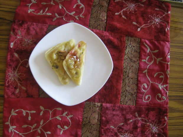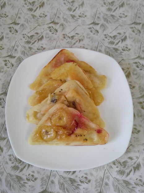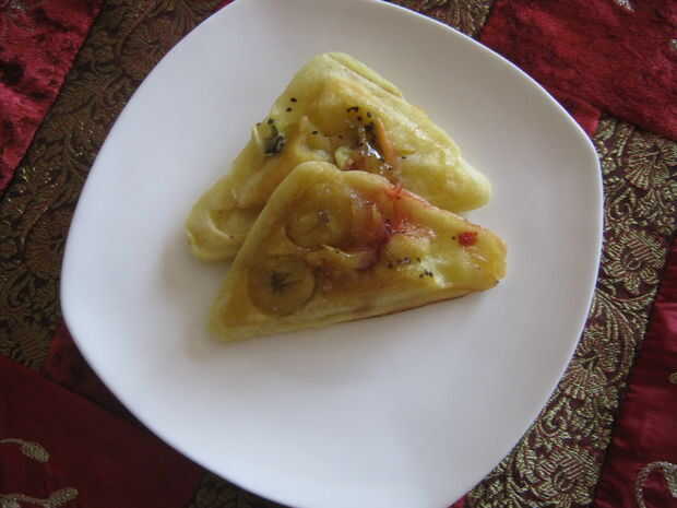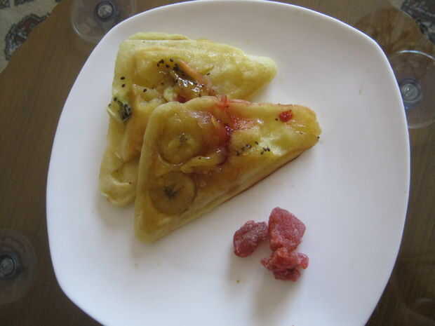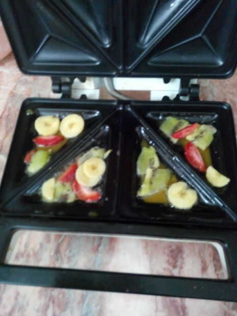 6. Añadir el azúcar caramelizado. Añadir los frutos en la parte superior. Luego cuchara en la mezcla de pastel en cada uno de los cuatro pozos de la sandwichera.