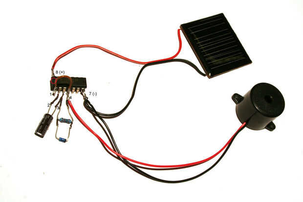 Como pequeño generador de sonido utilizamos un circuito integrado (IC) llamado "Hexagonal tipo de disparador de Schmitt 74HC14" que nunca fue pensada para hacer el sonido. Consta de seis inversores idénticos y con dos de ellos construimos un oscilador simple usando 1 resistor, 1 condensador, (opcional) 1 diodo, célula solar 1 y 1 altavoz piezoeléctrico.