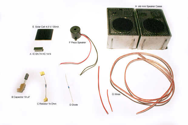 E 1 x celda Solar 4.5 V / 35mA (o utilizar un panel de iluminación jardín viejo)