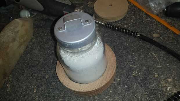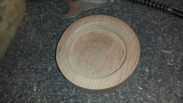 yo quería la botella con Pop seguro. Lo más importante, no debería pasar si el pistón está inclinado. Con stock de roble rojo de 3/4, remontar la botella hacia fuera. Cortan la mayor parte del material en el círculo con la pieza Forstner. Después de eso, puse en el torno y había limpiado para arriba. Taladré contra hundido los agujeros en la parte inferior de la cámara del pistón para sujetar firmemente el vaso de botella de vidrio en su lugar.