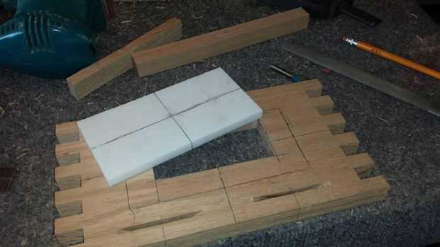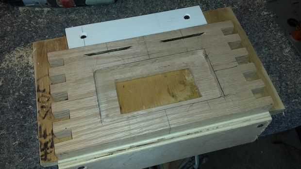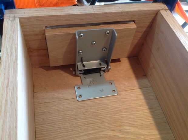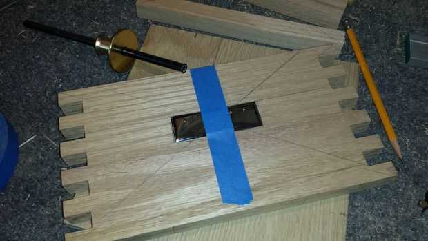 Se me ocurrió una manera bastante aseada de enganche de la caja cerrada. Usé este resorte bisagra tenía sobras de un proyecto anterior. Movido de un tirón alrededor para que empuje y no tire. Utilizando un router que hice un bolsillo empotrado en el frente que actuaría como una placa adornada, utilicé un trozo de mármol fino que tenía y ajustaron un pedazo fino de roble en la parte posterior. Me recortan cuadrados y luego comenzó a trabajar en la parte del fiador.