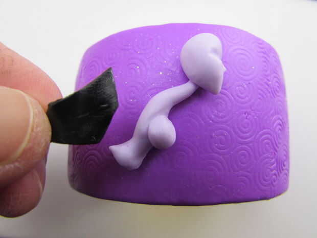 Añadir en su pecho una forma redonda de su pecho y un aplanado de barro negro para su superior. (foto 4)