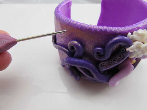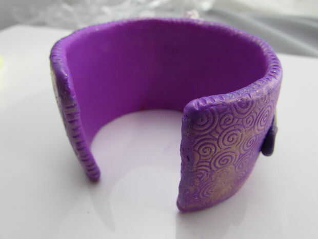 Cuando la pieza se enfría completamente, estirar otra hoja plana de arcilla violeta y colóquelo en el otro lado de la banda. Mezcla la arcilla sobrante de la arcilla y hacer guiones con una herramienta de la aguja.
