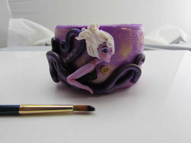 Para agregar más detalles sobre Ursula, pintura color durazno en la mejilla, en la cima de la nariz, codo y mano. La pintura púrpura los labios rojos y párpados. También ligeramente pinté la parte superior de los tentáculos negros. Utilicé pinturas set calor pero se pueden utilizar pinturas acrílicas o pasteles.