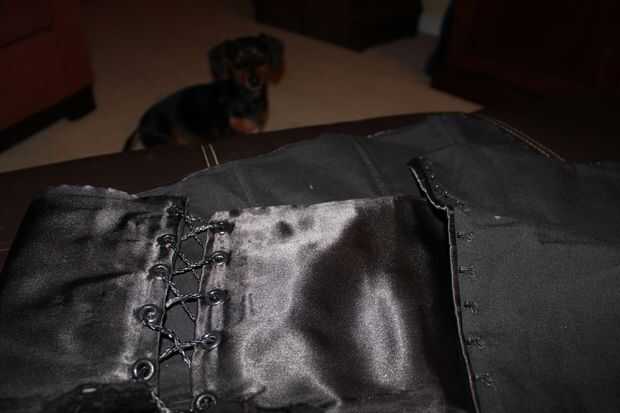 La parte superior del corsé es corta y se detiene en la cintura. Usé tela cubierto deshuesado y entretela fusable para estructura. El frente tiene cierre de gancho y del ojo. La espalda tiene ojales y cordón de cuero para atar juntos trenzado. No pude encontrar negro ojales por alguna razón, por lo que rociar pintaron.