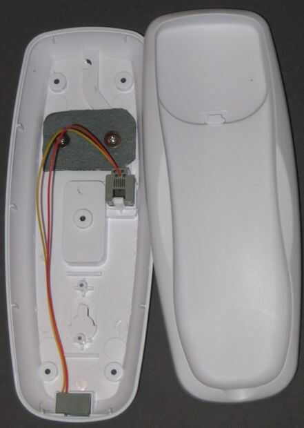 El teléfono que elegí es de una sola pieza tipo. La primera imagen a continuación muestra que la base del teléfono con la tapa quitada nota que no hay nada dentro de la base excepto los cables que conectan a la toma para el cable del auricular con un conector de teléfono modular estándar.
