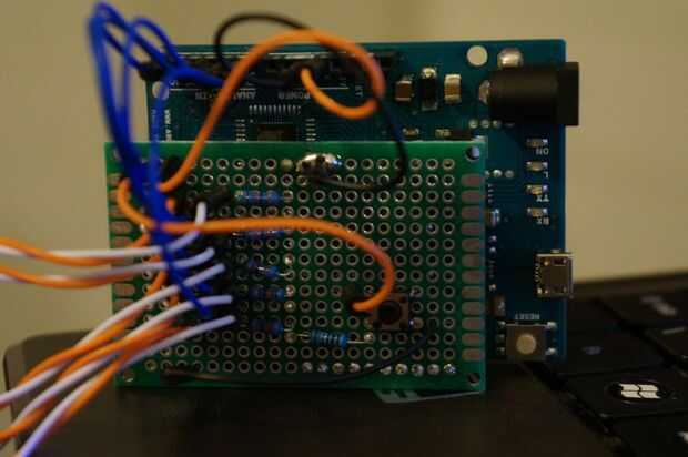 Potencial para lecturas analógicas de los sensores de flexión, se utiliza circuito divisor. Basé mi la potencial configuración de divisor de un instructables por dschurman encontrado aquí, pero con la adición de un botón para activar el programa que lee los sensores de encendido y apagado
