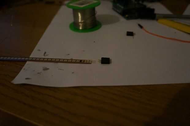 Soldar los cables directamente al sensor quitaría algunos de la complicación agregada que incluye este paso pero te recomiendo este paso como los terminales o conectores une la sensación de sensores muy frágil, las cabeceras fueron soldadas en, entonces envuelto en cinta aislante con una capa de calor retráctil aplicada sobre. Esto da la base del sensor de una mejora significativa en la rigidez y protección más de flexión que puede dañar los pines.