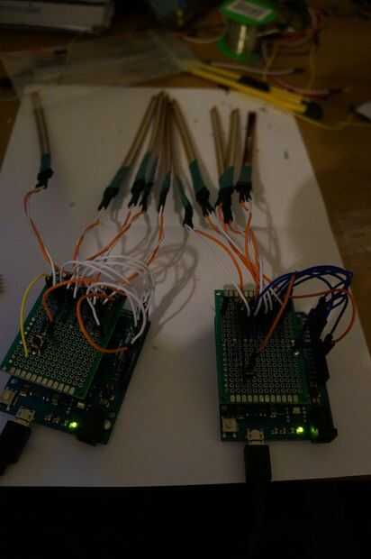 Ahora es el tiempo que fije la placa de prototipo para el escudo de arduino como se indica en el diagrama del circuito y los sensores de flexión si no has sido soldados en directamente, también es tiempo para designar una unidad como la mano izquierda y como un derecho ya que existe un código independiente para cada uno.
