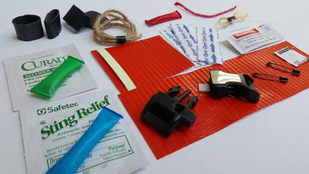 Preparación para el segundo los suministros médicos colocándolos en un 6" correa de cinta del conducto. Espaciar los elementos uniformemente a lo largo de la correa de la cinta para que no sean voluminoso. Tenga cuidado de no colocar objetos cerca de las dos áreas donde la pulsera se dobla naturalmente a la forma a la forma circular para adaptarse a una muñeca. Envuelva los artículos hasta forma una forma tubular.
