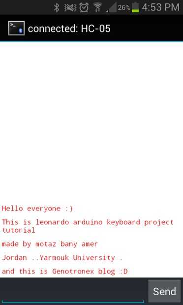 Aquí envié palabras desde mi android a arduino para imprimir en el editor de texto.