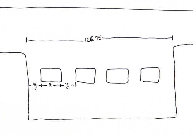 Este es un simple x y ecuación. En este caso x = la anchura del marco y y el espacio entre los marcos. También, medir la extensión total de la pared.En mi caso, el total de la pared espacio = 126 3/4" que es 126.75 si expresamos en un decimal (a convertir a una fracción cuando terminamos).