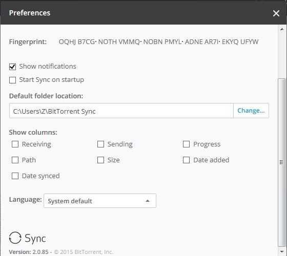 Ajustes generales permite cambiar si la sincronización se iniciará cuando el ordenador arranca, la ubicación de carpeta predeterminada para la sincronización y las columnas que se mostrarán en la Página principal tales como progreso, el tamaño y la fecha fue sincronizado.