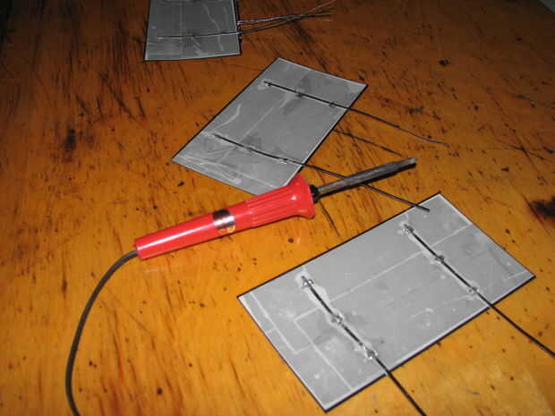 Le corté dos pedazos de alambre tabulación 6" de largo. Luego que soldados la espalda primero. http://sites.Google.com/site/earthforsolar/Glass-Frame-DIY-panel