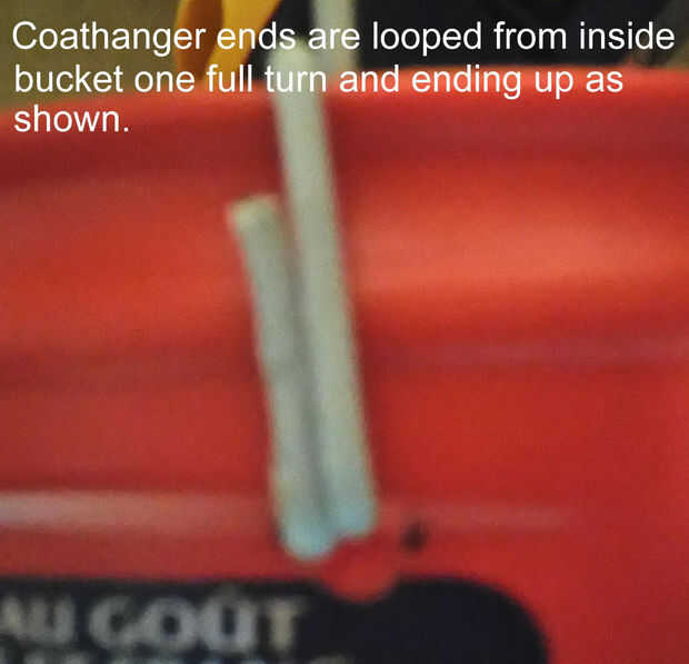 Los agujeros son taladrados 1 1/4 pulgadas desde la parte superior del cubo. Los dos extremos de alambre de percha están doblados desde el interior de la cubeta a través del orificio de 1/4 de pulgada en la parte superior y hacia atrás a través del agujero otra vez, eventual terminando para arriba 3/4 del camino hasta el exterior.