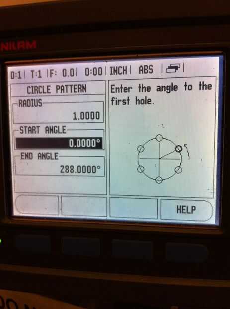 Introduzca el radio del círculo o círculo parcial que desee. Luego introduzca el ángulo de inicio. Esto es clave si usted tiene un patrón de desplazamiento del agujero. El ángulo final no cambió y está basado en su comienzo ángulo y cuántos agujeros le tienen. Cuando haya introducido toda la información Presione nuevamente el botón de abajo y la pantalla 3 aparecerá.