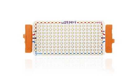 Perf Board: El perf es pequeño, bien, perf board con un sistema de macho y hembra bitsnaps Unido. Para construir un módulo de inclinación con tres salidas, como se muestra en la introducción, usted necesitará fijar un conjunto de más de bitsnaps. El tablero de perf viene con VCC y tierra enrutado por el tablero, hacer cableado un poco menos densa.