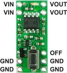 Las conexiones del interruptor son bastante sencillos. Hay dos pernos para la tensión en (VIN), dos para voltaje de salida (VOUT), cuatro para tierra (GND) y un pin marcado OFF.