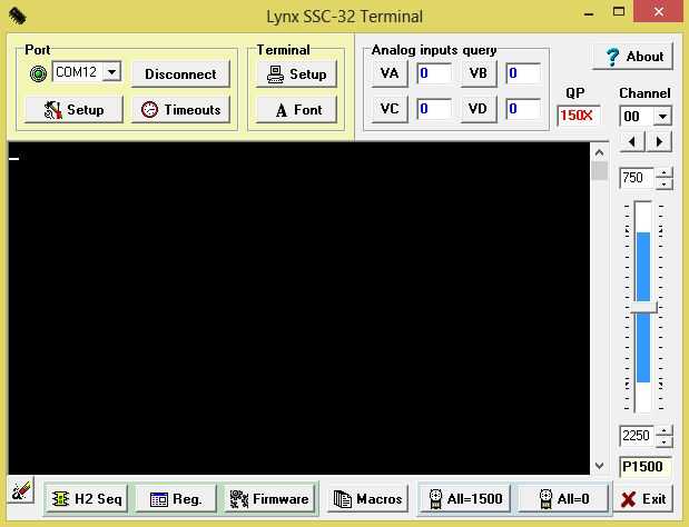 Terminal de lince SSC-32 En mi caso el SSC-32 conectarse COM 12 como se muestra en el diagrama