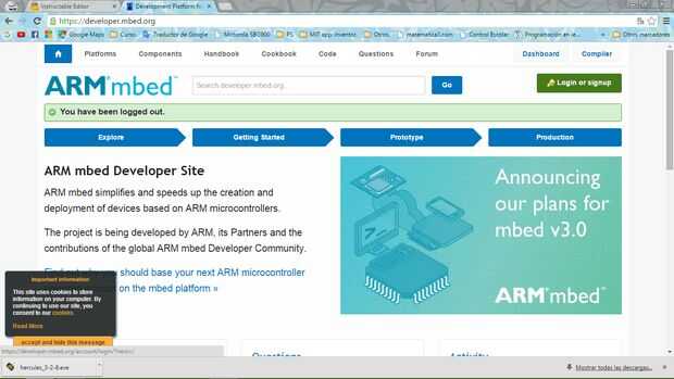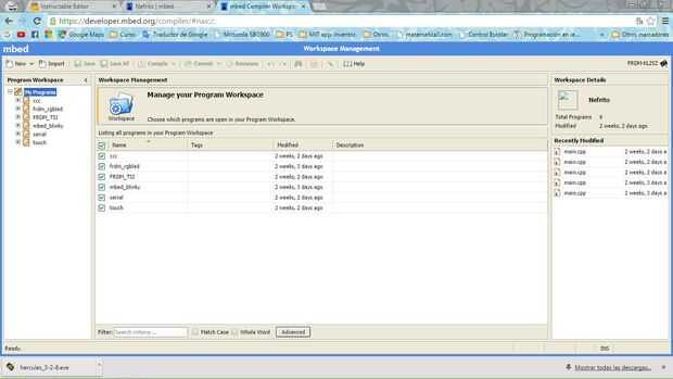 Pero bueno, vayamos al punto, ¿cómo c la programo? A continuación veremos una aplicación usando el sensor capacitivo pantalla la tarjeta tiene integrado. 1-la programación. Usaremos el sistema de desarrollo de descargas en línea de mbed para. Tendremos crear nuestra cuenta para poder acceder al portal, en caso de que no tengamos una ya. Una vez creada nuestra cuenta entraremos en la sección del compilador. En la parte superior derecha estará el botón de "Developer site". En la nueva ventana, nos vamos al botón "Compilador" de igual manera, esta en la parte superior derecha de la pag. En esta ventana en la estamos, están las opciones ofrece el sistema mbed para, donde puedes encontrar la ayuda, las instrucciones, documentacion, etc. en la página. A continuación aparece ya el entorno de desarrollo. Ahí, en la parte superior izquierda, daremos clic en "Nuevo", "Nuevo programa". Después aparece en pantalla un recuadro donde seleccionaremos la plataforma de desarrollo, el arrancador y el nombre del archivo.