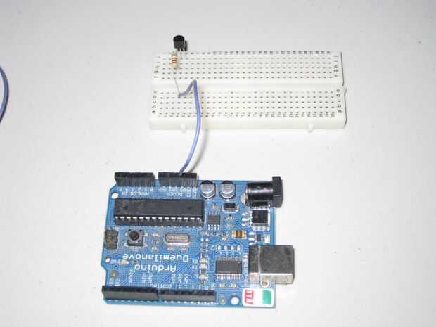 Ahora conecte una resistencia del centro del sensor y correr al otro lado de la protoboard. Conectar la resistencia al pin de 5V de tu arduino.