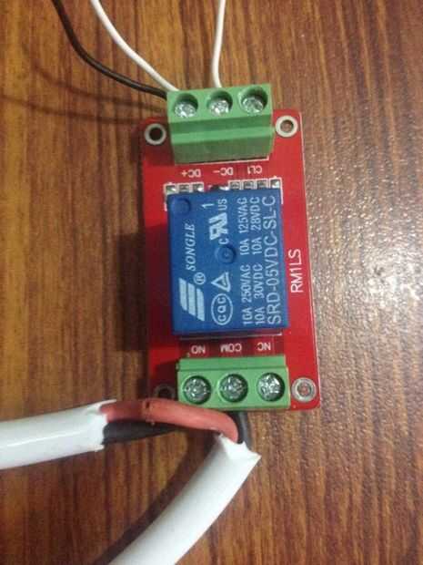 Yo estoy usando el módulo de relé de 5V por RM1LS, es un módulo de bajo costo, fácilmente disponible de eBay. El número de modelo del relé es SRD-05VDC-SL-c Hay muchos artículos ya disponibles con instrucciones claras sobre cómo utilizar estos módulos de relé, he utilizado este instructable. Como mi módulo es ligeramente diferente cuando se trata de marcado de los pernos, voy a enumerar aquí las conexiones: