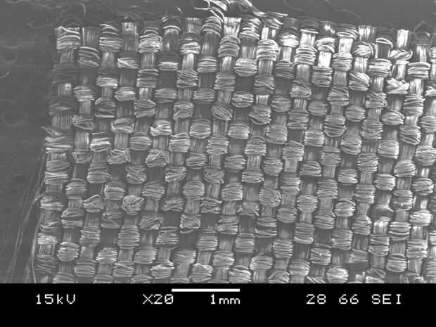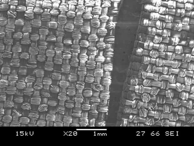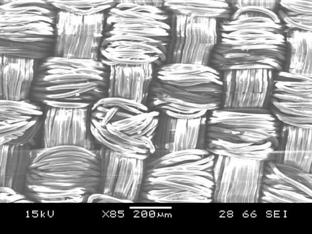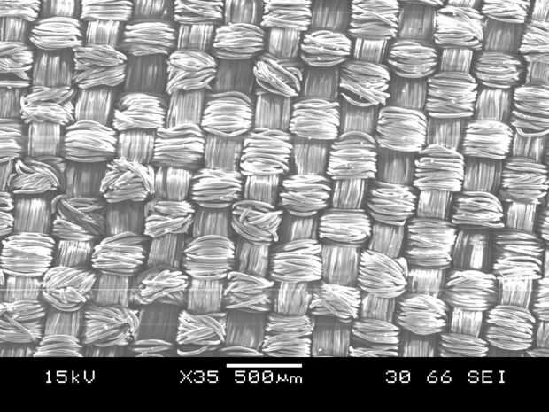 Mirando las fotografías SEM, se teje la tela produciendo el mismo patrón en la parte delantera y parte trasera de la tela. Mirando la foto con 85 aumentos, la tela no es muy bien tejida ya que mucha de las fibras no están mintiendo recta y las bolsas producidas por el tejido no es muy visible.