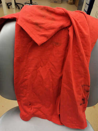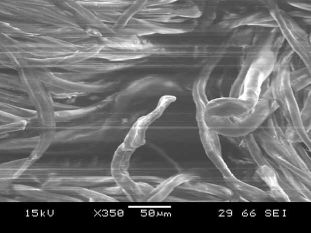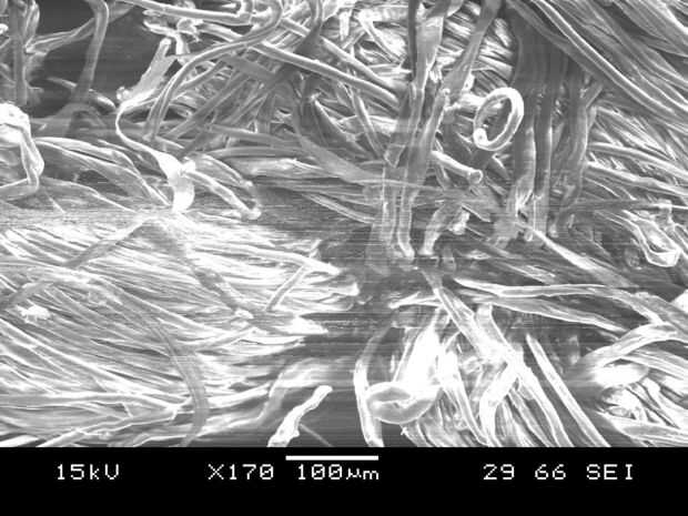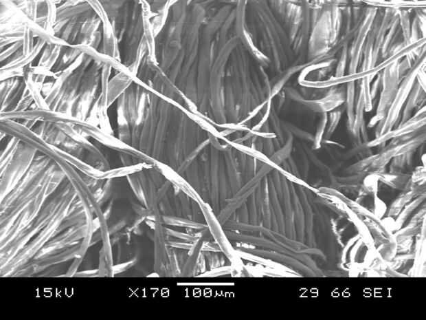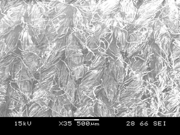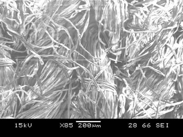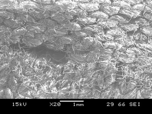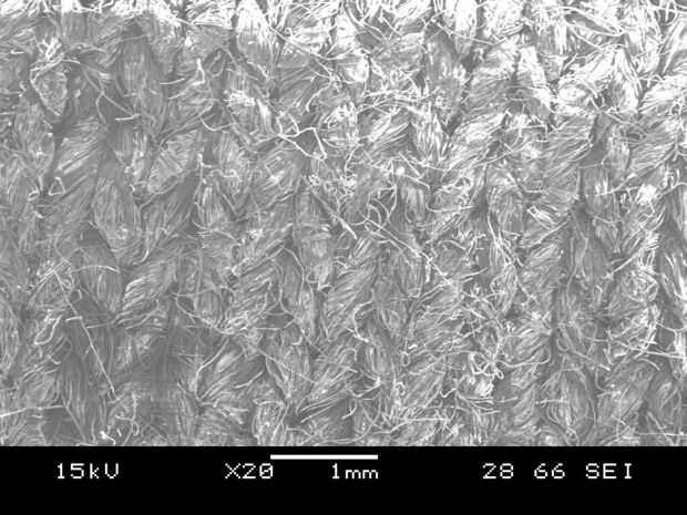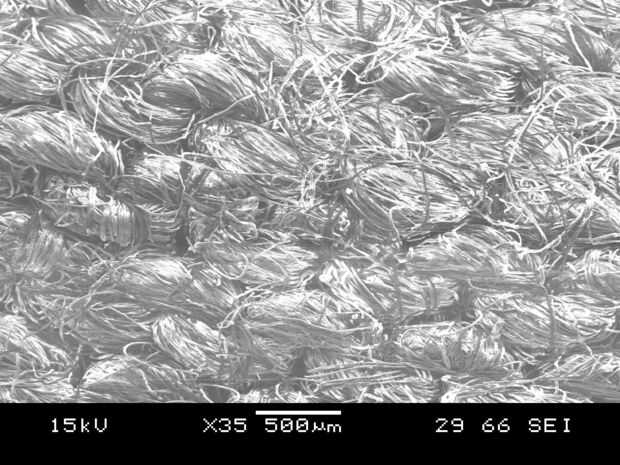 Cotton-polyester t-shirt. Punto claro y elástico. En estas imágenes de microscopio, el tejido de esta tela es muy clara. Indica que la tela se estira, causando los agujeros entre los hilos a ser más grande y no es ideal para la filtración.