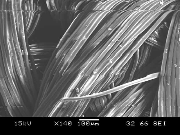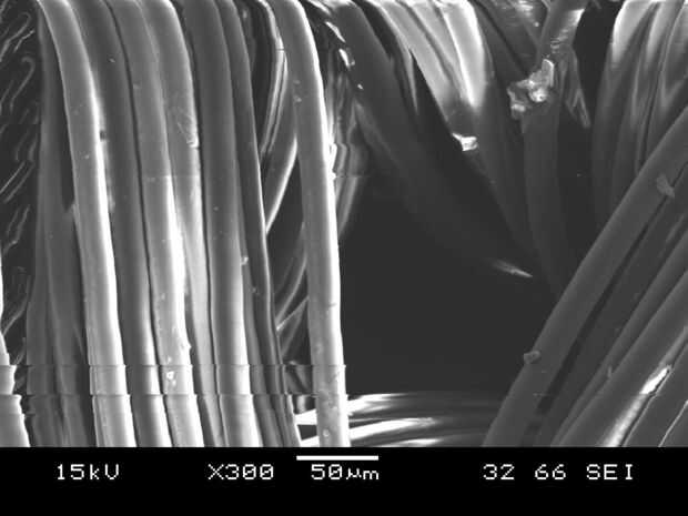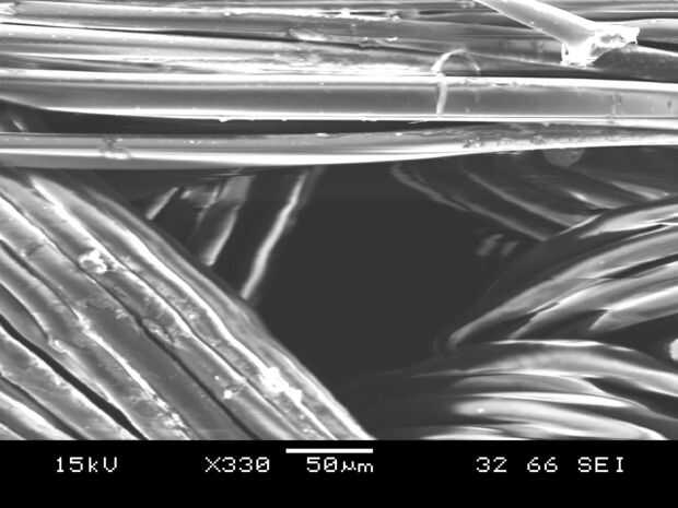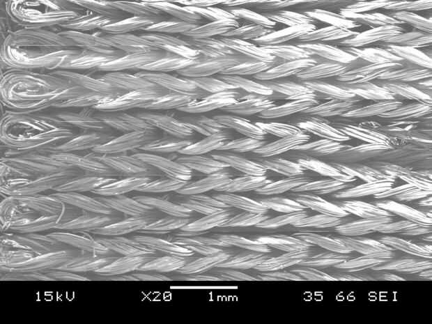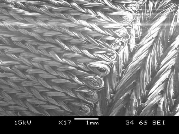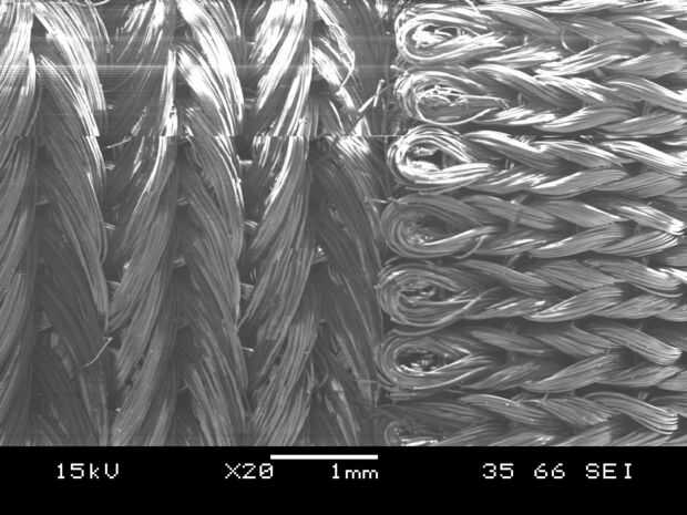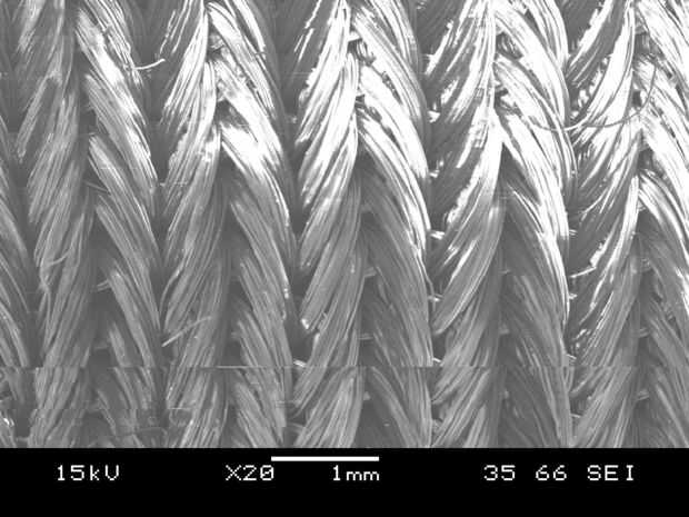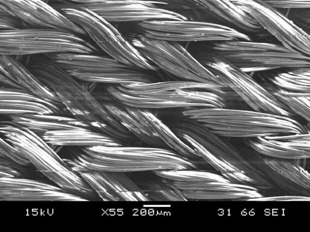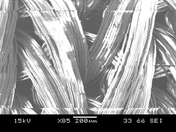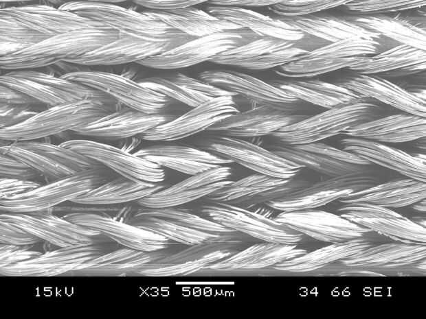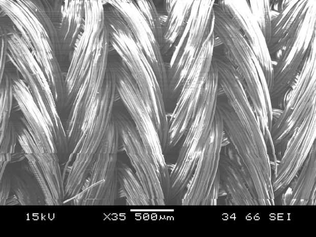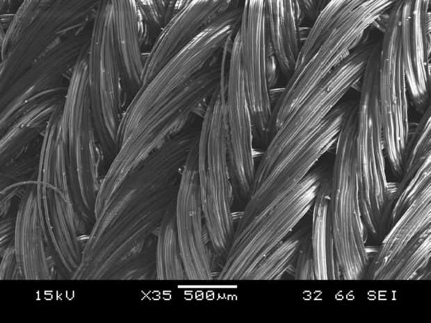 Los cuadros de la demostración del microscopio que esta tela es de punto y aunque cuando pruebas a la tela a mano no es muy elástica, tiene aún suficiente dan en abrir agujeros entre las fibras y no filtran el agua muy bien.