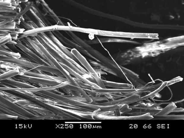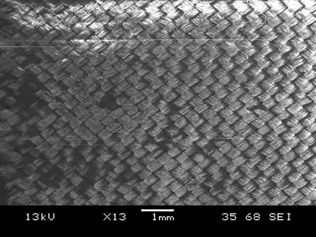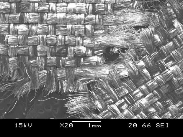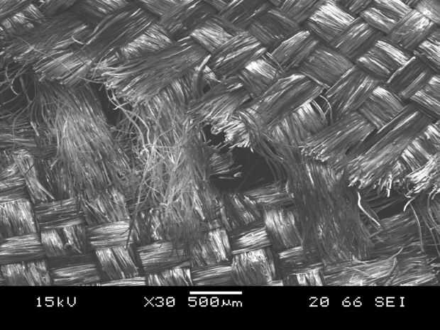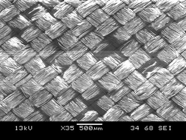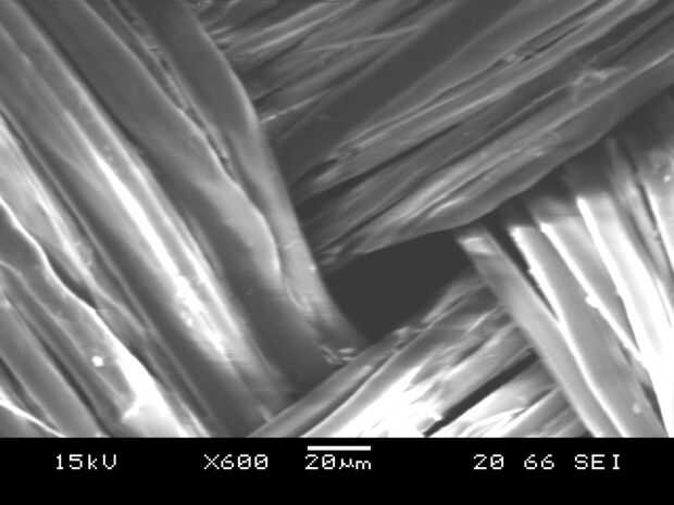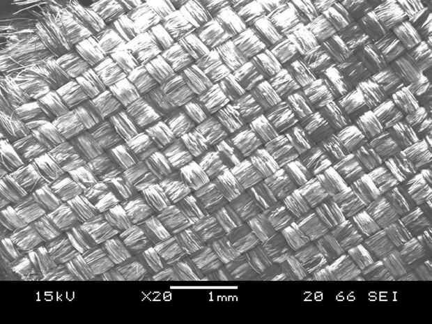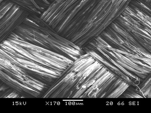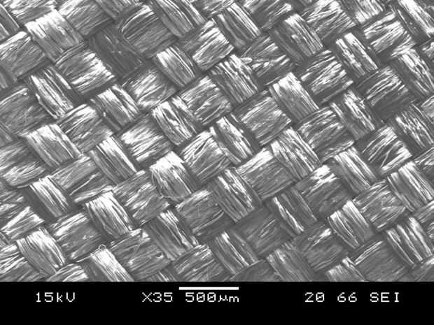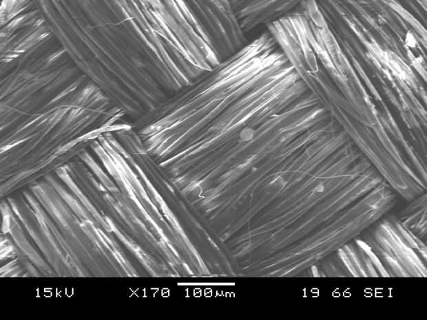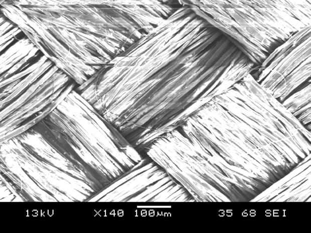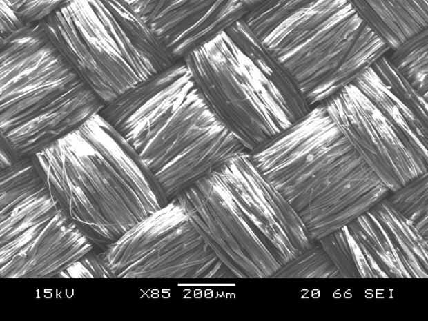 En las imágenes de microscopio, vemos que los hilos utilizados para la urdimbre y la trama son del mismo tamaño y crean un patrón de tejido muy uniforme y sólido.