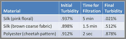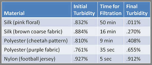 Estos resultados son similares a lo que esperábamos inicialmente. La seda finamente tejida de los pantalones horribles trabajó para reducir la turbidez, tomando el agua de. 832% turbiedad sólo. 011% turbiedad. Por desgracia, tardó casi una hora para filtrar una pequeña cantidad de agua. La camiseta de punto de nylon hizo casi nada, tomando la turbiedad de. 927% a. 912%, una diferencia que es apenas visible a simple vista. Esto era probablemente debido al punto de la tela, que era elástica, no tejido.