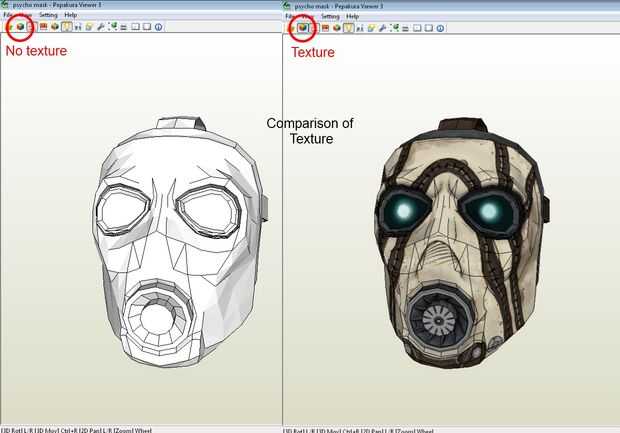 Hay algunas maneras de impresión dependiendo de qué tipo de objeto su impresión y su propósito. Usted puede haber notado sus modelos con una "textura", si su impresión para hacer un cosplay prop, puedes imprimirlo normal y ahorrar tinta en la pantalla superior izquierda, podrá notar 2 cubos con una cara roja, azul y verde, el de la izquierda más muestra la textura, haga clic para apagarlo o haga clic otra vez para mostrar la textura. Si va a imprimir un modelo de la exhibición, se recomienda mantener en la textura por lo que al montarlo, se puede visualizar sin pintando. (si hay una textura, recuerde que no todos los modelos tienen texturas.) Este modelo de un bandido psycho de borderlands muestra textura y sin textura.