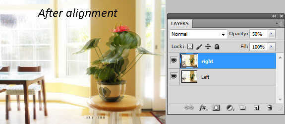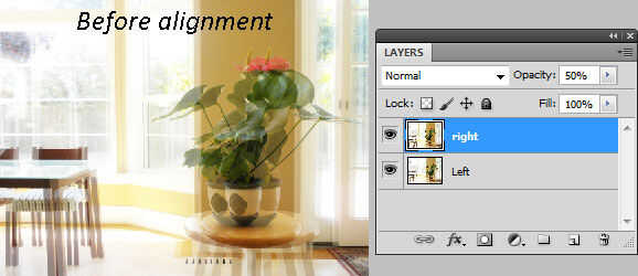 Abrir ambas imágenes en Photoshop. Copiar y pegar la imagen de la derecha encima de la imagen izquierda. Ajuste [opacidad] de la imagen de la derecha a cerca de 50% para que pueda ver a través de él y la imagen izquierda por debajo de ella.