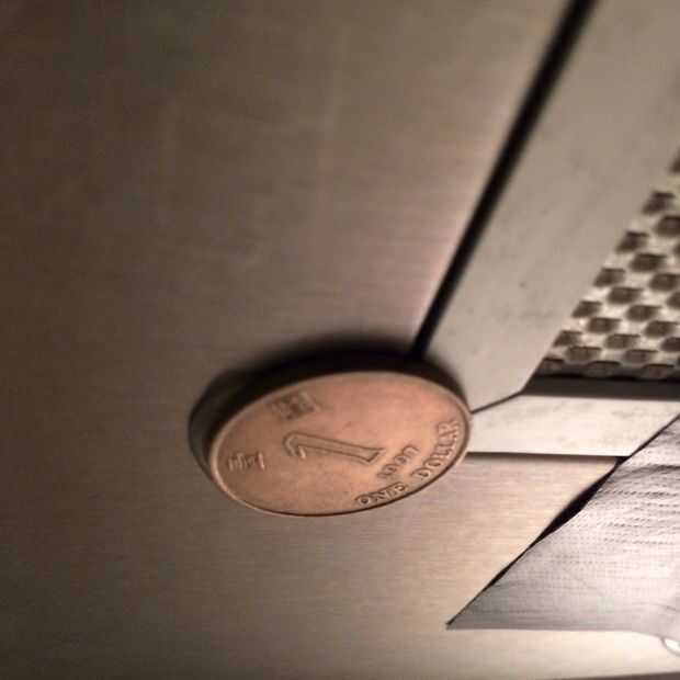 Usando seis monedas para fijar el filtro roto y caído cubiertas del ventilador en la cocina