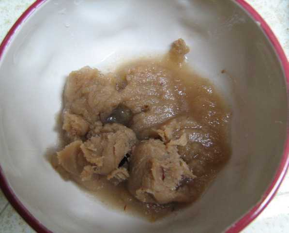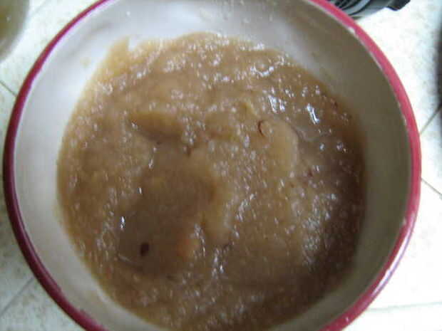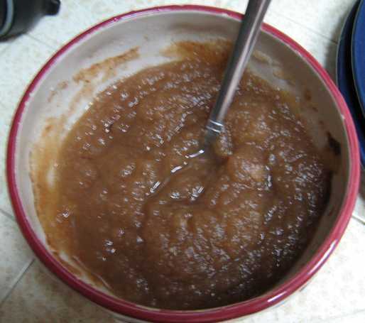 En la foto es todo el proceso. Terminé de comer para el desayuno. El sabor era aún anodino, pero podría ser mejor con jugo de manzana en lugar de agua, o con una diversa variedad de manzanas. Lo que es clase de fresco sobre este proceso es que usted puede hacer salsa de manzana concentrado si mides los ingredientes; para el almuerzo sólo agregar agua!