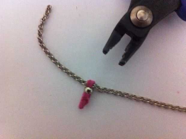 Simplemente doble la pieza de cuero en 2 sobre la cadena y coloque una gota de presión sobre los dos extremos y apriete con los alicates.