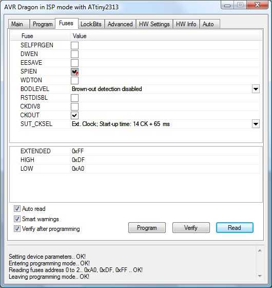 Flash el programa a la 2313 ATiny, primero empieza AVR Studio y cree un nuevo proyecto de "Ensamblador" para el ATtiny2313. A continuación, seleccione "Herramientas -> programa AVR -> conectar" y seleccionar "USB AVR de dragón". Seleccione Leer configuración de HW: ahora puedes ver que se detecta 5 V, si todas las conexiones están bien. Seleccione "Principal -> ajustes" y utilizar 125 kHz (menos problemas con los cables largos) y confirme con "Write". Luego ejecutar "Principal -> firma de leer" y usted debería ver la primera imagen adjunta.