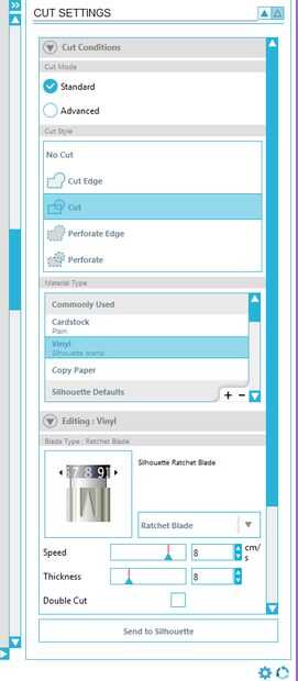 Incluso si has usado previamente la silueta para cortar otros materiales, hay una buena oportunidad de los ajustes de profundidad de corte no será convenientes para el vinilo. Haga clic en ajustes de corte y luego en vinilo. Se puede escoger la profundidad de corte apropiada para el vinilo que tienes - me parece que una profundidad de corte de 8 es generalmente fina. Siempre hacer un corte de prueba si usted no está seguro, en lugar de tirar una hoja de vinilo!