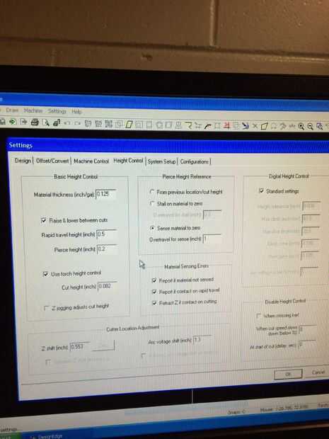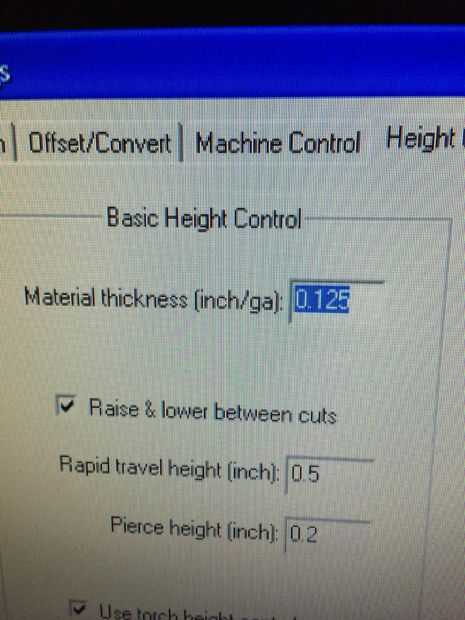 Medir el espesor del material, para luego entrar en Configuración > Configuración > Control de la altura en la ficha básico altura control de espesor del material. Luego ajuste el cortador del plasma a la configuración de amperaje adecuado.