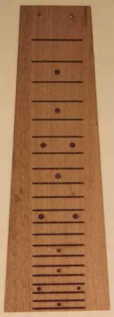 Las marcas de tablero del traste están grabadas a una profundidad de 0,020" utilizando la configuración de la trama. Cinta de enmascarar de pintor azul puede utilizarse para minimizar el ardor de la cara superficial. Hay varias opciones para aumentar el contraste visual entre los trastes y el material de fondo. Si se desea el grabado trastes y marcadores pueden ser inlayed con una madera contrastante como arce o ébano o con cáscara como abulón o nácar. Las incrustaciones se cortan al tamaño con el láser. Algún ensayo y error es necesario para alcanzar un cabe apretado por las incrustaciones debido a las tasas de quemadura diferentes en los distintos materiales. Es importante utilizar una cantidad adecuada de pegamento al colocar los trastes para que no asomen durante el proceso de lijado. Epoxy teñido puede utilizarse como una alternativa más rápida para incrustar los trastes y marcadores. Simplemente llene demasiado las ranuras de los trastes con el epoxi tintado y luego lijar el exceso después de que se ha fijado.