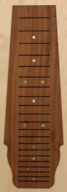 Se muestran dos versiones del tablero del traste. la primera es simplemente grabada con láser. El segundo tiene incrustaciones de ébano para los trastes y olmo para los marcadores. Los trastes fueron cortados de láminas delgadas de madera de ébano y e incrustaciones de una forma procesada de concha de abulón "Ablam" que se puede comprar en línea.