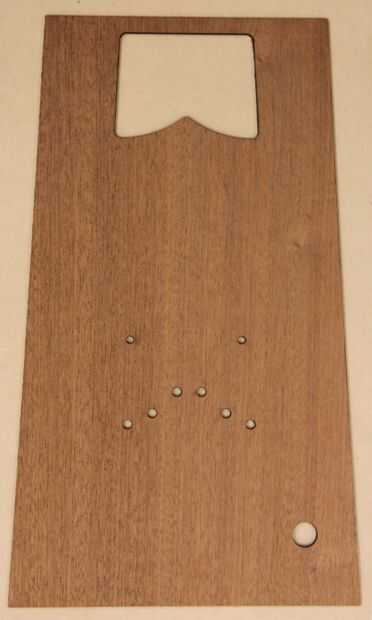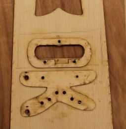 Dos partes adicionales conforman la tapa armónica. Un puente y cadena de peg de apoyo y un refuerzo de la recogida (sólo se requiere si un if una electrónica recogida está instalada) está pegado a la parte inferior de la tapa armónica. Los frenillos son laser-cortó a partir del mismo material que la tapa armónica pero tienen el grano corriente perpendicular a la tapa armónica. Utilizamos pequeños tornillos y tuercas para alinear los orificios de las abrazaderas con ésos en la tapa armónica y, al mismo tiempo, para fijar las piezas juntas mientras el pegamento seca. Las llaves son de una tarjeta de sonido de sitka spruce tiene agujeros de montaje para una recolección, control de volumen y control de tono.